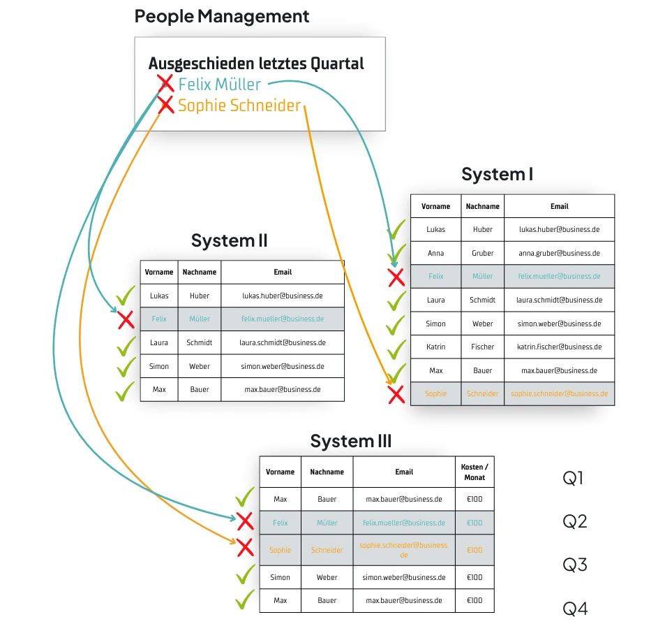 Das People Management zeigt, dass Felix Müller und Sophie Schneider im letzten Quartal ausgeschieden sind. Ihre Konten existieren in verschiedenen Systemen jedoch weiterhin – das manuelle Vergleichen von Benutzerlisten über mehrere Systeme hinweg ist zeitaufwendig und fehleranfällig.