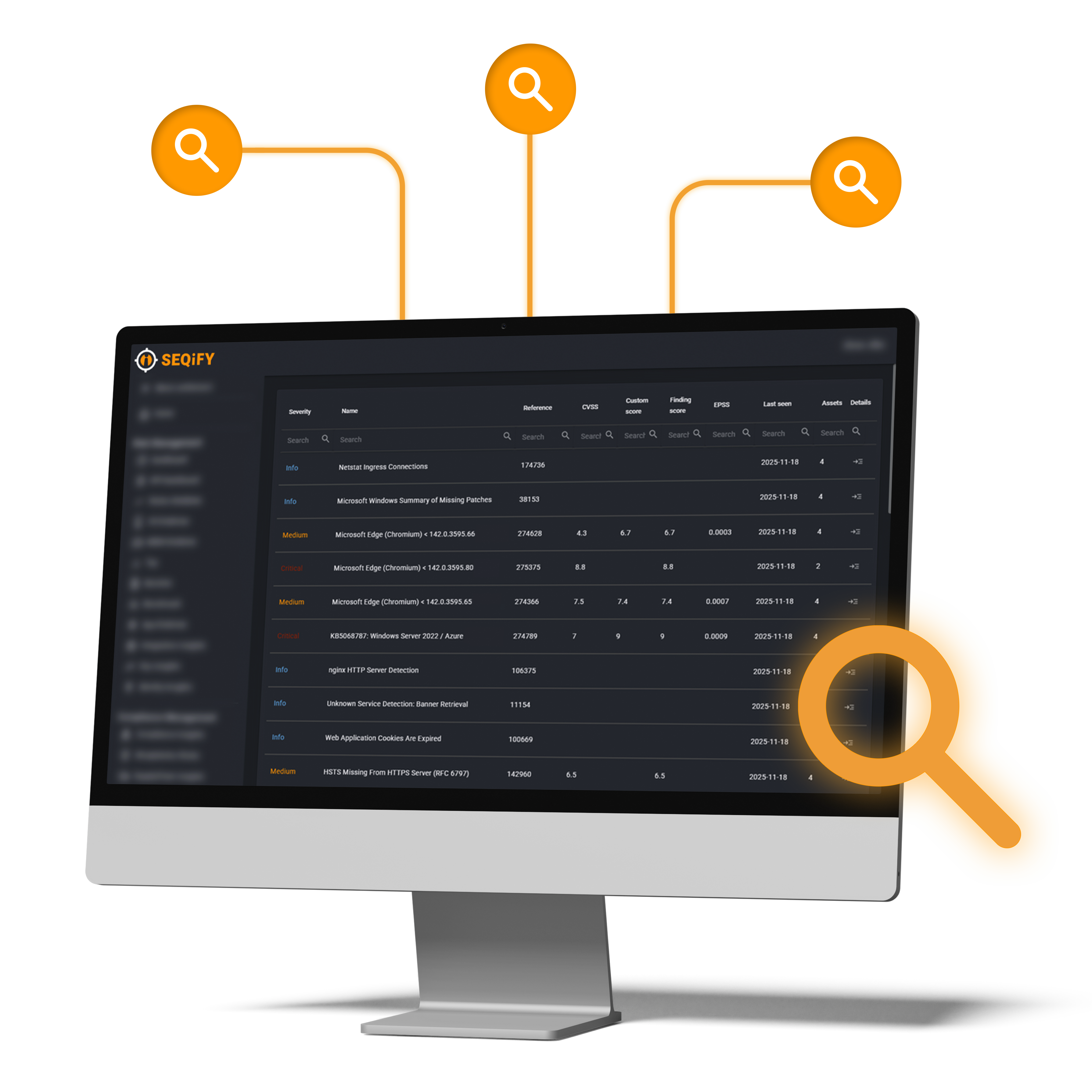 Mit SEQIFY erhalten Sie eine vollständige, systemübergreifende Übersicht darüber, welche Risiken auf welchen Assets tatsächlich bestehen. Findings aus Scannern wie Nessus werden automatisch den betroffenen Systemen, Servern, Endpoints oder Anwendungen zugeordnet. Dadurch entsteht erstmals ein konsistentes Bild Ihrer gesamten IT-Landschaft – inklusive Kritikalität, Zuständigkeiten und tatsächlichem Risiko pro Asset.