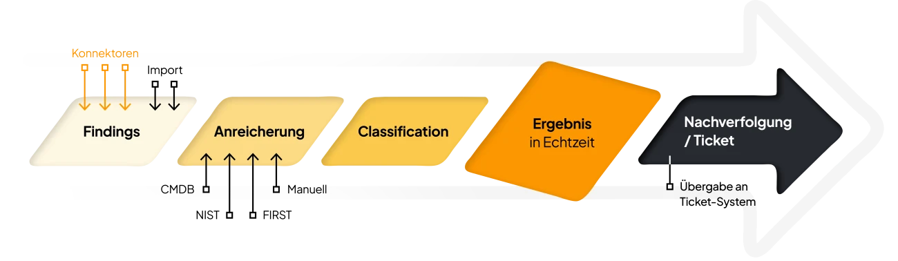 Alle Schwachstellen, Warnungen und Findings werden aus unterschiedlichen Quellen automatisch übernommen – etwa aus Vulnerability-Scannern, Pentests oder weiteren Security-Tools. Diese Daten bilden die Ausgangsbasis für die weitere Risikobewertung.