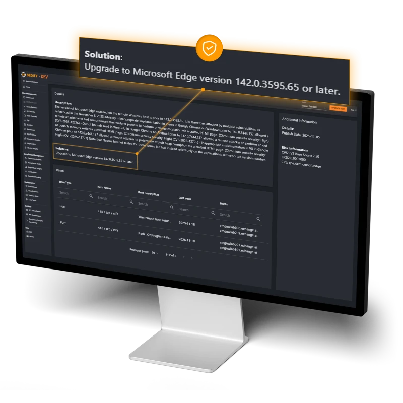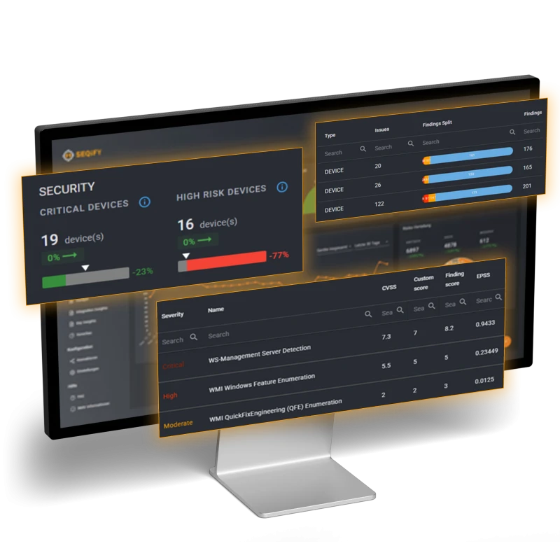 Mit SEQIFY erhalten Sie eine vollständige, systemübergreifende Übersicht darüber, welche Risiken auf welchen Assets tatsächlich bestehen. Findings aus Scannern wie Nessus werden automatisch den betroffenen Systemen, Servern, Endpoints oder Anwendungen zugeordnet. Dadurch entsteht erstmals ein konsistentes Bild Ihrer gesamten IT-Landschaft – inklusive Kritikalität, Zuständigkeiten und tatsächlichem Risiko pro Asset.